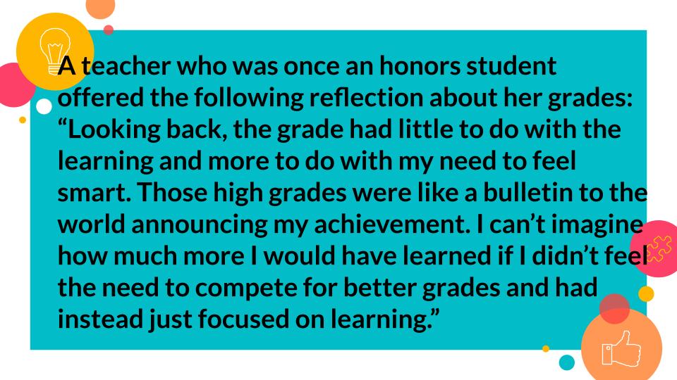 But I could feel the energy in the room. Some of them—those who were already intrinsically motivated, those for whom grades always just got in the way—wanted a different answer. So I offered it to them.