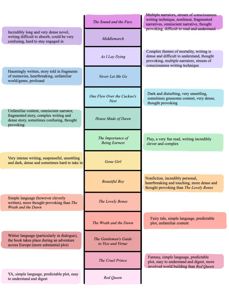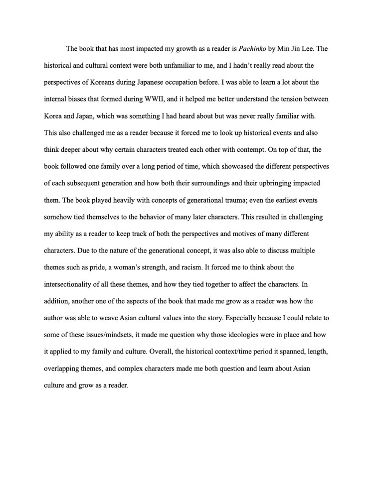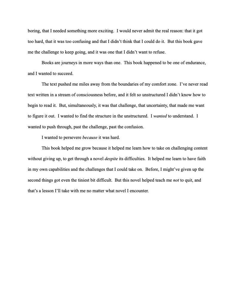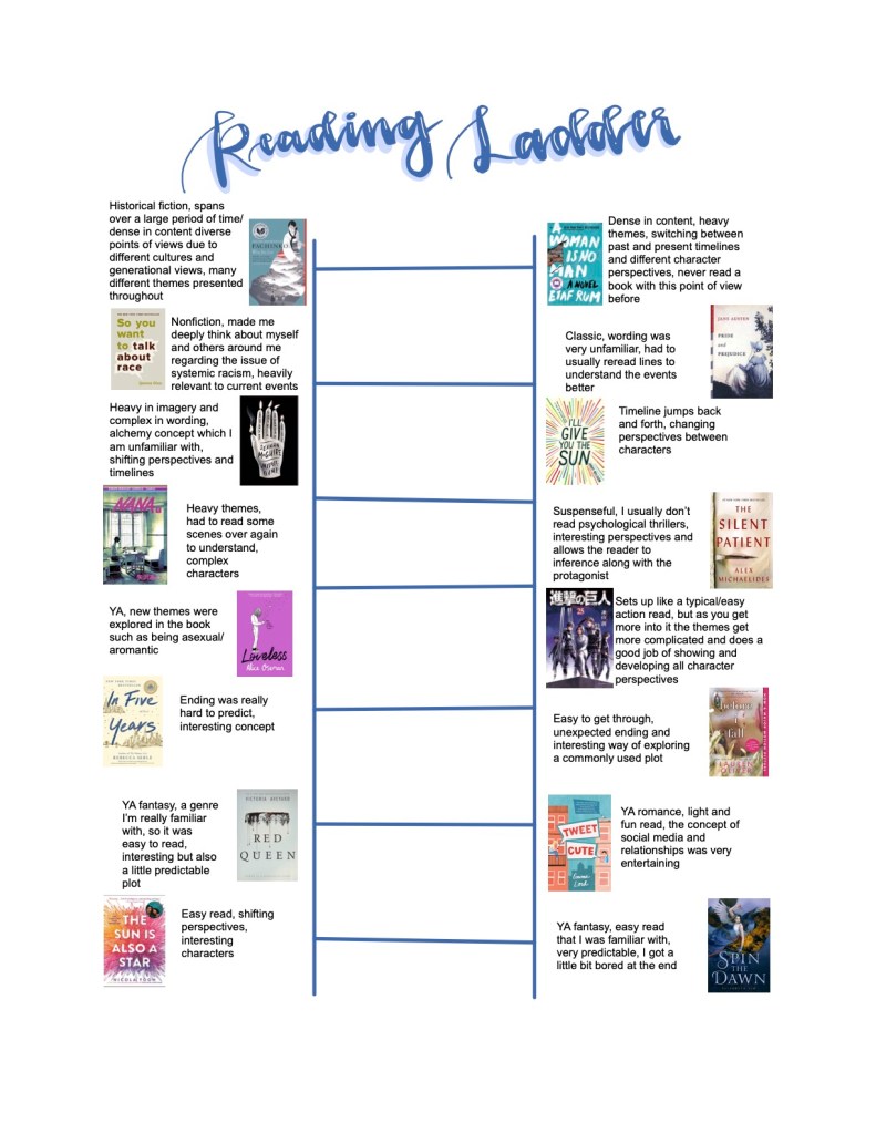 Speaking of Penny Kittle, she has a brilliant assignment that she calls a Reading Ladder. She has examples of assignment sheets on her website, but the basic idea is to have students organize the books they read from least to most difficult and to include a rationale for their choices. I suggest spending some time in class discussing the different ways in which books can be challenging (length, vocabulary, genre, content, structure, etc.). I did this assignment after the first semester. In addition to the ladders, I asked my students to write a reflection about the book that had the most impact on their growth as readers and HOW it changed them. Here are two examples from my AP Language class:
