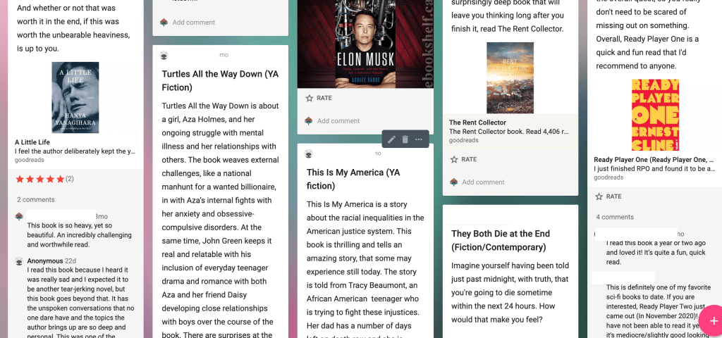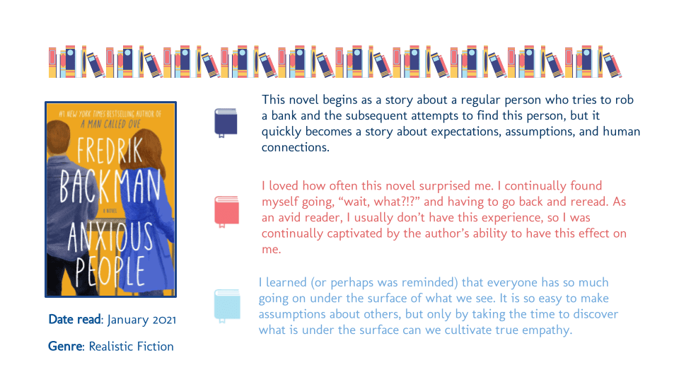 As an end-of-year celebration, I want to take this one step further and turn it into a shared slideshow: something my present and future students can use to find next reads. Something my students can look back on to remember this crazy year where, in spite of all the obstacles, we managed to build an amazing community of readers.