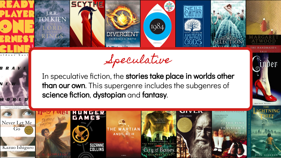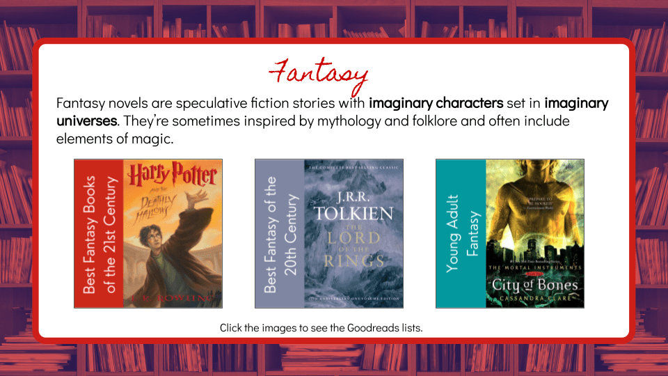 I also encourage my students to embrace what they already enjoy. If they are going to be successful in creating a reading routine, they need to be excited to open the book. I provide support through personalized recommendations and curated lists from Goodreads. If you aren’t familiar with Goodreads, it is an incredible reading resource. I invite (but do not force) my students to become friends with me on Goodreads so they can access my recommended reading shelves and observe as I model my own reading life. The Listopia community-created reading lists are an amazing feature, and these are what I use to create my own curated resource. To help my students navigate the potentially overwhelming number of lists on Goodreads, I give them a slideshow (available here on TpT) that defines the most popular genres and links to Goodreads lists for each genre. Here are a few example slides from that resource: