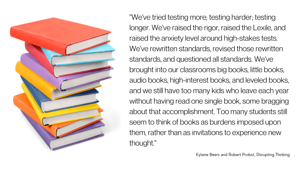 Regardless of our approach to teaching reading in high school, the above description probably sounds familiar to most secondary English teachers. We know most of our students don’t enjoy the books we give them. We know they don’t get much (besides stress and frustration) from the questions, tests, and essays that always accompany assigned reading because we teachers need something to measure and motivate. Perhaps most disconcerting, we know they don’t actually read—and yet we continue to accept their fake reading because we genuinely don’t know how to solve this problem.