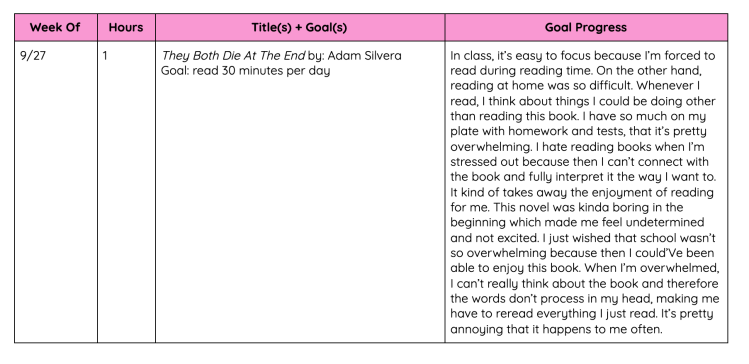 I also don’t give them points for their reading. People who have been following this blog know that I don’t give points on any assignments (it’s kind of the theme here), but I think it is worth discussing specifically in the context of independent reading. To collect reading data, I ask students to log the time they spend reading each week and to reflect on both the book and the process of reading. I tell them early on that I expect them to read a minimum of 2 hours each week. But sometimes they don’t, and that’s ok. If they never meet the 2 hour mark, then we talk about what might be getting in their way. This will likely have some effect on their quarter grade, but it’s not fixed in an unforgiving structure. What’s more important is their willingness to try new strategies until we figure out what will work for them.
